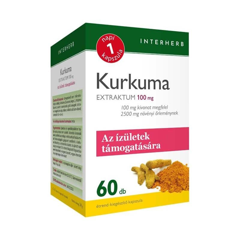 A kurkuma nemcsak fűszerként egyre népszerűbb hazánkban, a szervezetre gyakorolt jótékony hatásait is sokan fedezik fel. Ízületvédő tulajdonsága mellett az emésztést is segíti: támogatja az emésztőnedvek termelését, hozzájárul a máj és az epe normál működéséhez.Szerepe van ugyanakkor az immunrendszer megfelelő működésében, valamint a normál vérkeringés és a szívfunkciók fenntartásában.Az Interherb Kurkuma kapszula a növény koncentrált kivonatát tartalmazza, rendkívül magas, 95%-os hatóanyag-tartalommal.