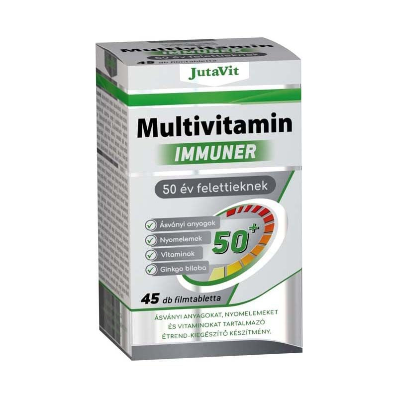 A JutaVit Multivitamin Immuner 50 év felettieknek olyan komplex termék, amely a vitaminok mellett számos ásványi anyagot, nyomelemet, likopint, luteint és Ginkgo Biloba kivonatot tartalmaz. A C-vitamin hozzájárul a fáradtság és a kifáradás csökkentéséhez, valamint fokozza a vas felszívódását. Az A, B6, B12, C, D3-vitamin, cink, folsav, réz, szelén hozzájárul az immunrendszer normál működéséhez. A cink hozzájárul a normál szellemi működés, valamint a bőr, a köröm, a haj normál állapotának fenntartásához. A magnézium hozzájárul a normál izomműködéshez és az idegrendszer megfelelő működéséhez. A B-vitaminok részt vesznek a normál energiatermelő anyagcsere-folyamatokban és hozzájárulnak az idegrendszer normál működéséhez. A folsav hozzájárul a normál vérképződéshez.